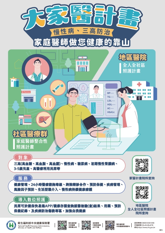 健保署推動大家醫計畫,由基層診所與合作醫院共同組成社區醫療群或由地區醫院組成團隊,提供整合性的醫療服務,轉知衛生福利部中央健康保險署「大家醫計畫暨健康存摺」宣導素材。