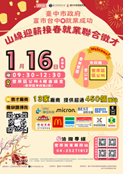 「富市台中 就業成功」山線迎薪接春就業聯合徵才 好職、好機會,山線新年一次全網羅!臺中市就業服務處將於115年1月16日(星期五)上午9時30分至12時30分,在豐原區公所4樓會議室辦理聯合徵才,邀請台灣美光、聯亞科技、全家便利商店及新天地等共13家,提供超過450個職缺,歡迎把握機會踴躍參加,活動詳情請至臺中市就業服務處官網查詢。