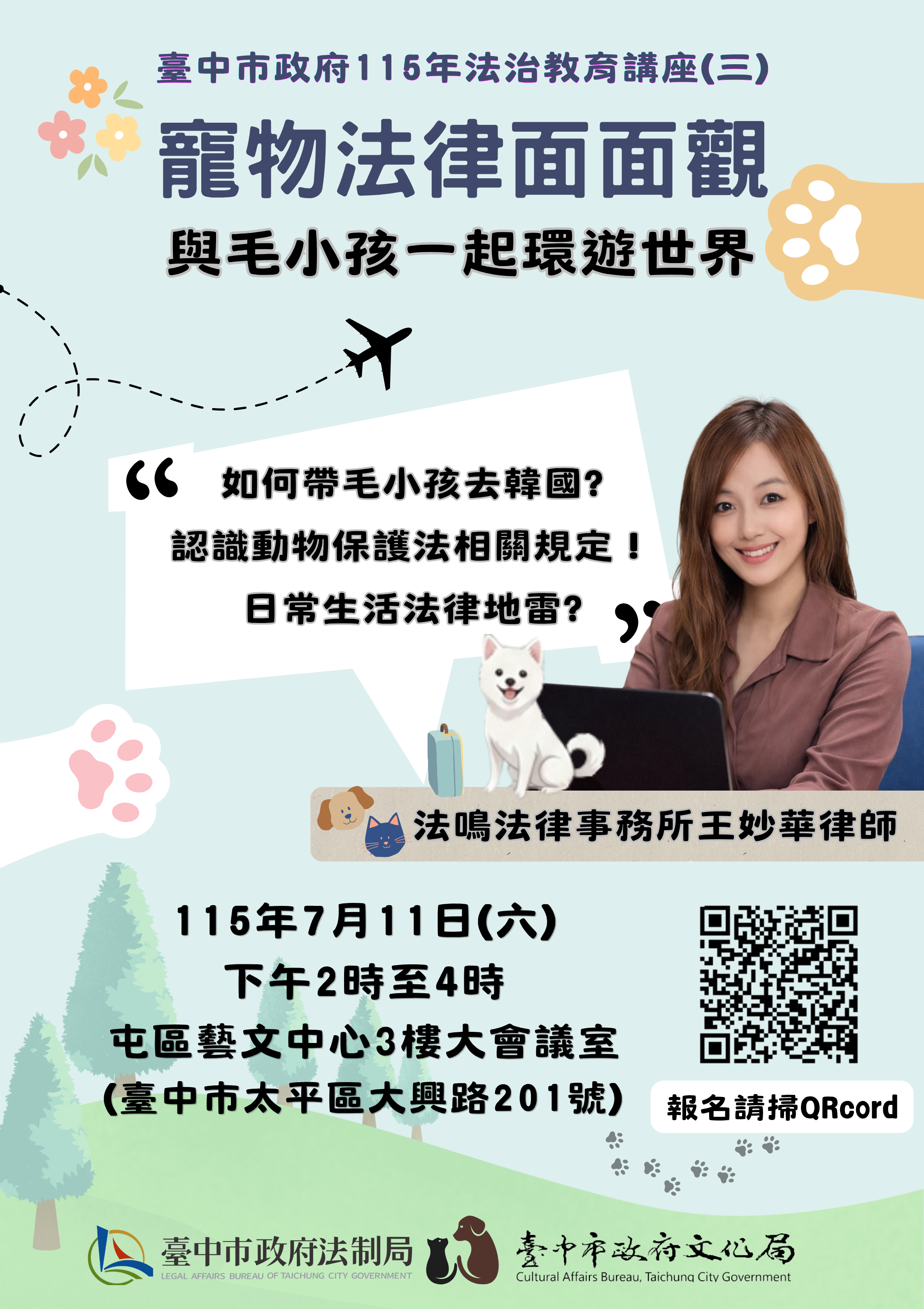 轉知:法制局與文化局合辦115年臺中市政府法治教育講座系列(三)「寵物法律面面觀-與毛小孩一起環遊世界」課程
